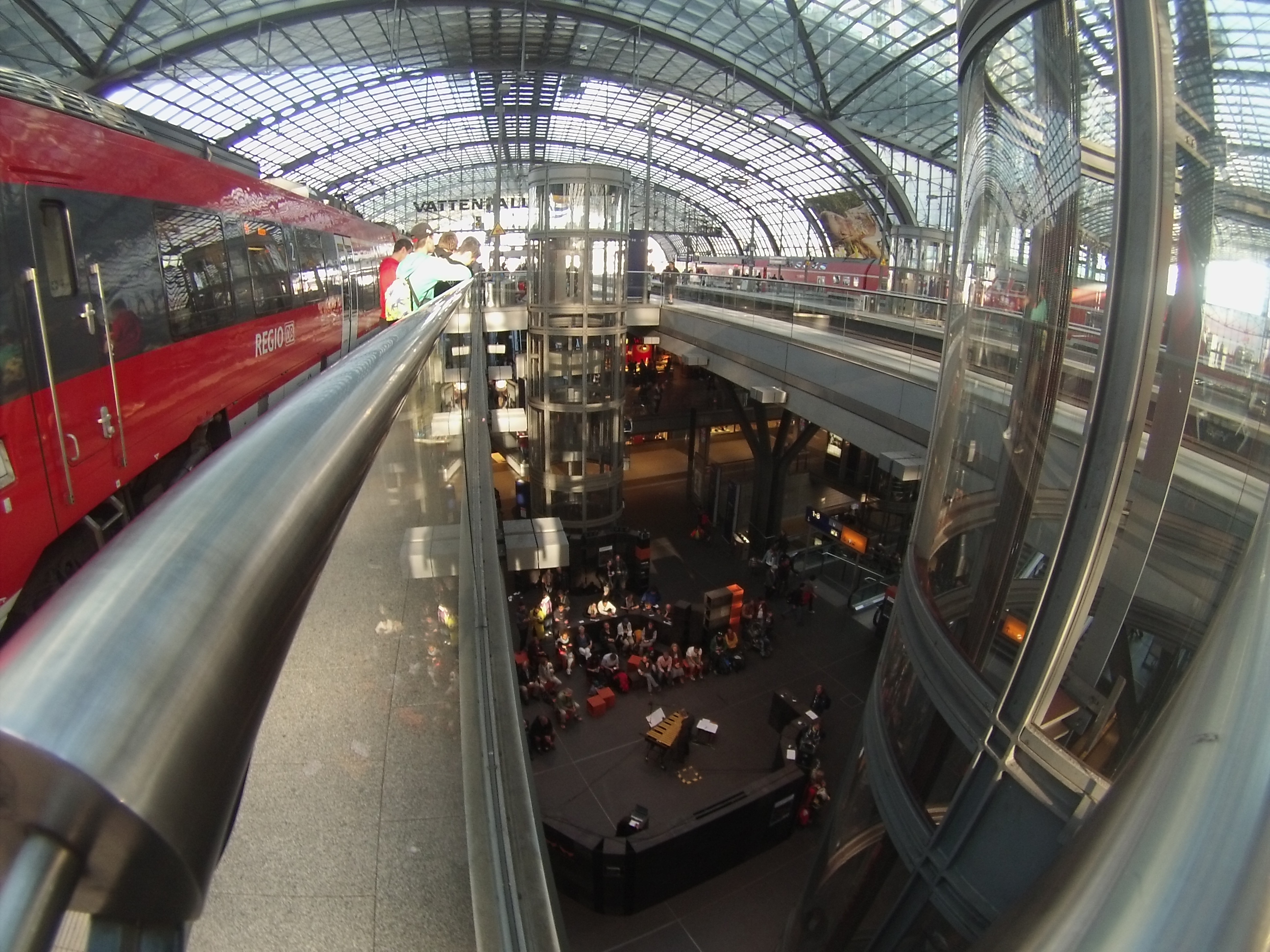 It's hard to get the sense from this photo, but the Berlin main station is a wonderful, light, open example of a modernised station. The entrance is beautifully open, the platforms go down a few levels, connected by these 'tubes' (and escalators!) and there's even free music concerts (see one level down).
