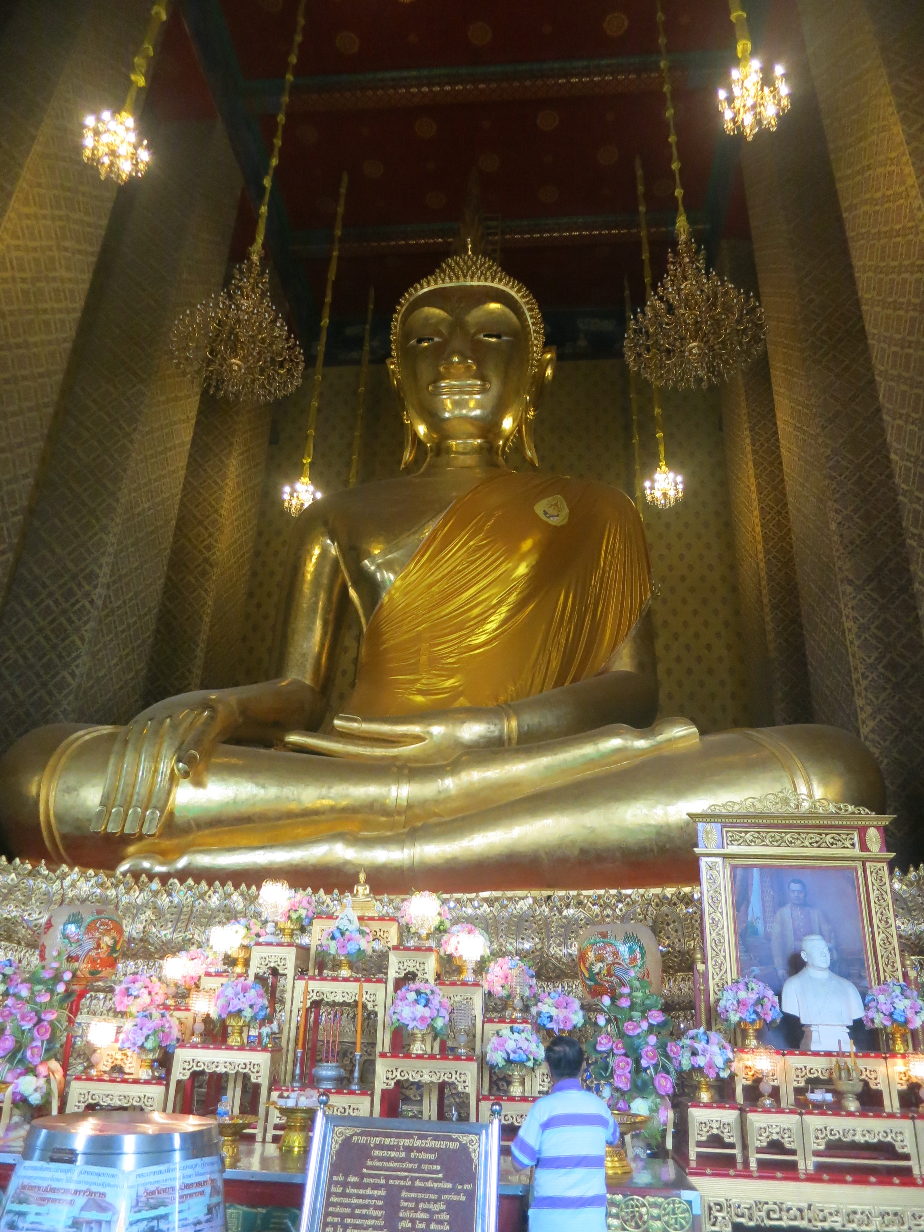 After going through the flower market, we emerged into the light of day next to the Chao Phraya, Bangkok's river, and got a public ferry across to a large Wat, inside which was a huge seated Buddha, all plated in gold. I can't help but feel old Mr. Gautama would be pretty disappointed at the way many of his essential teachings have been missed, particularly the bit about not worshipping idols (notwithstanding the pretty weak get-out-of-gaol-free card that an idol is an image of a god and Buddha isn't a god). But, as a piece of art and architecture it is impressive.