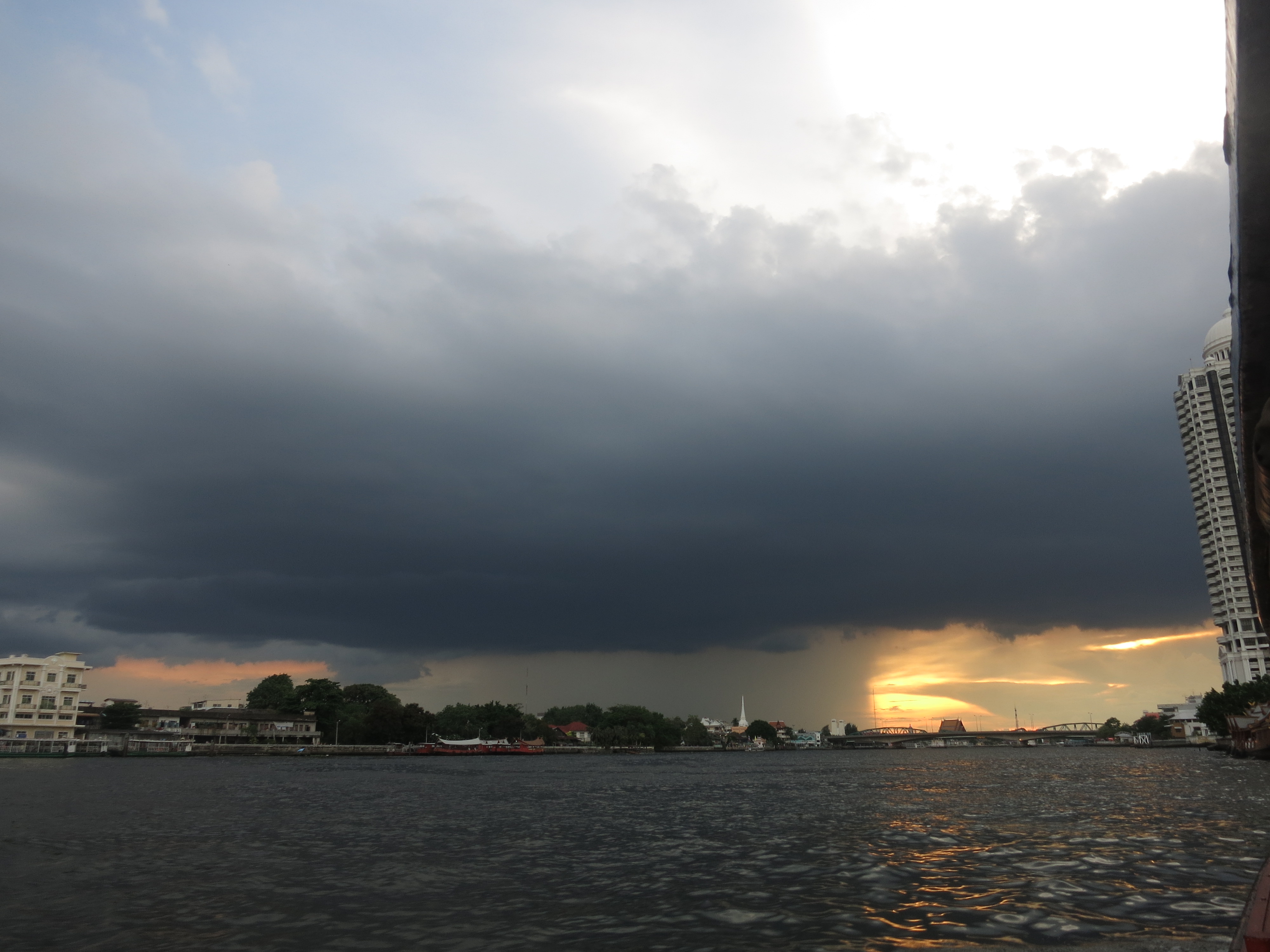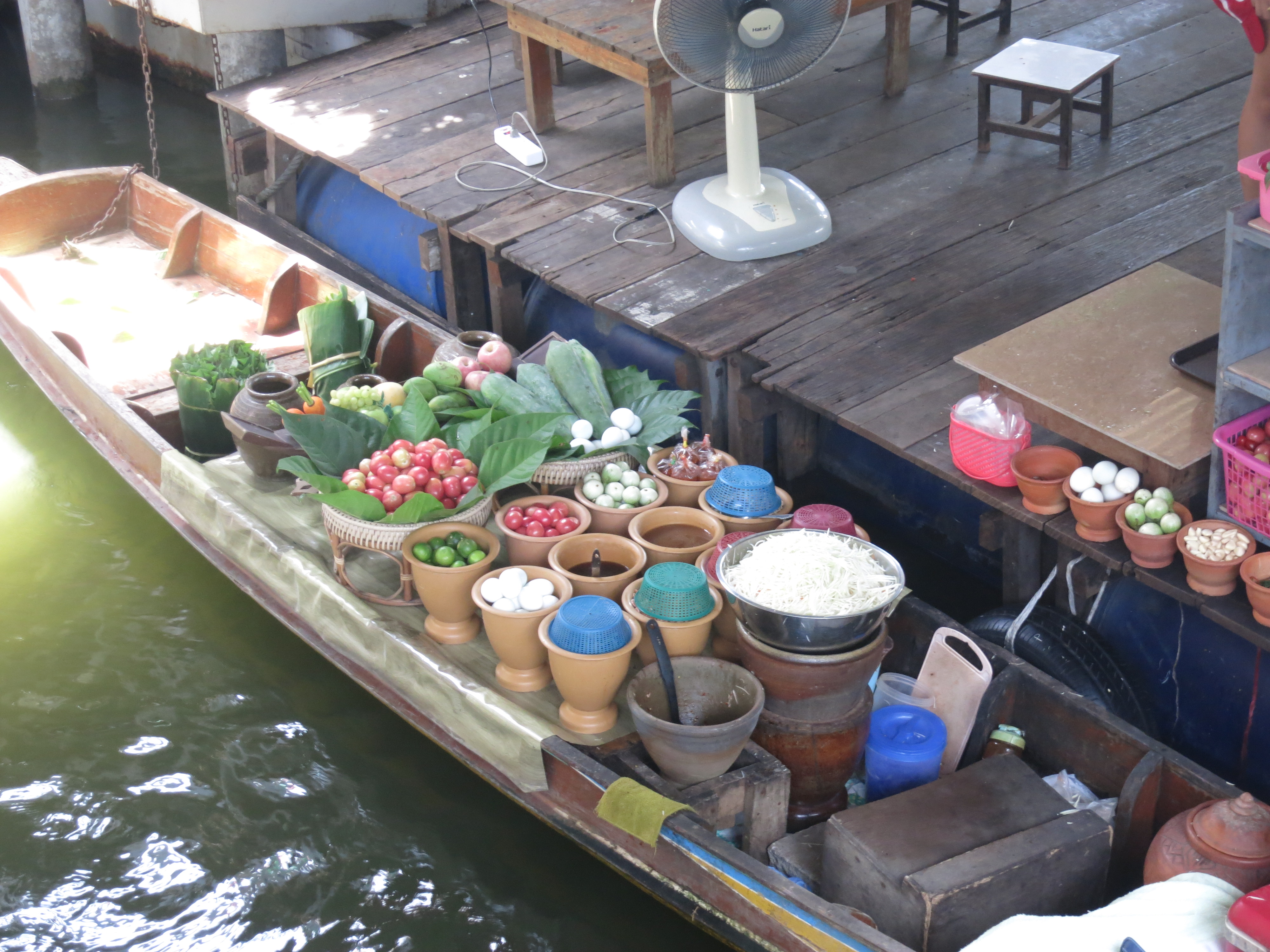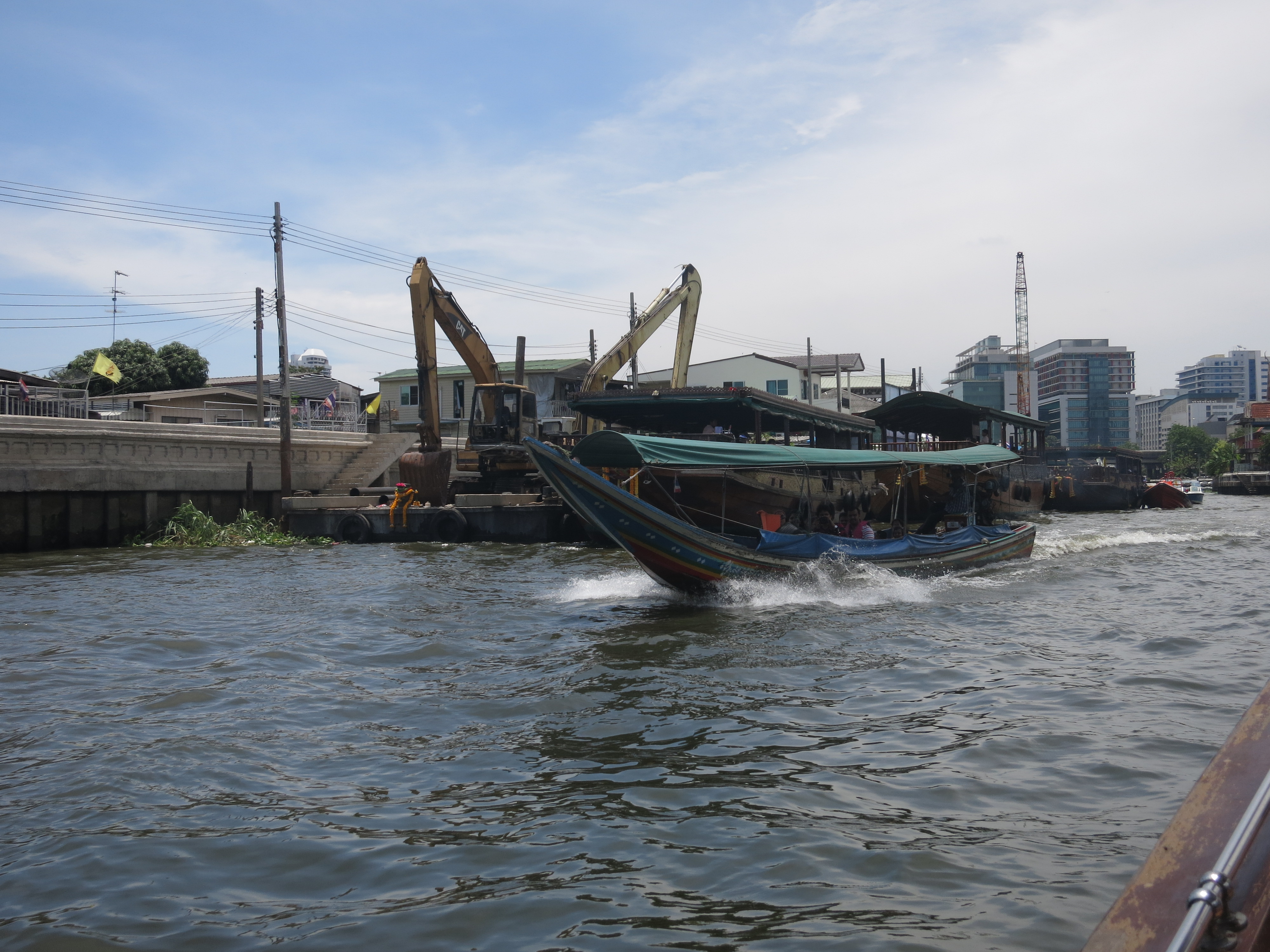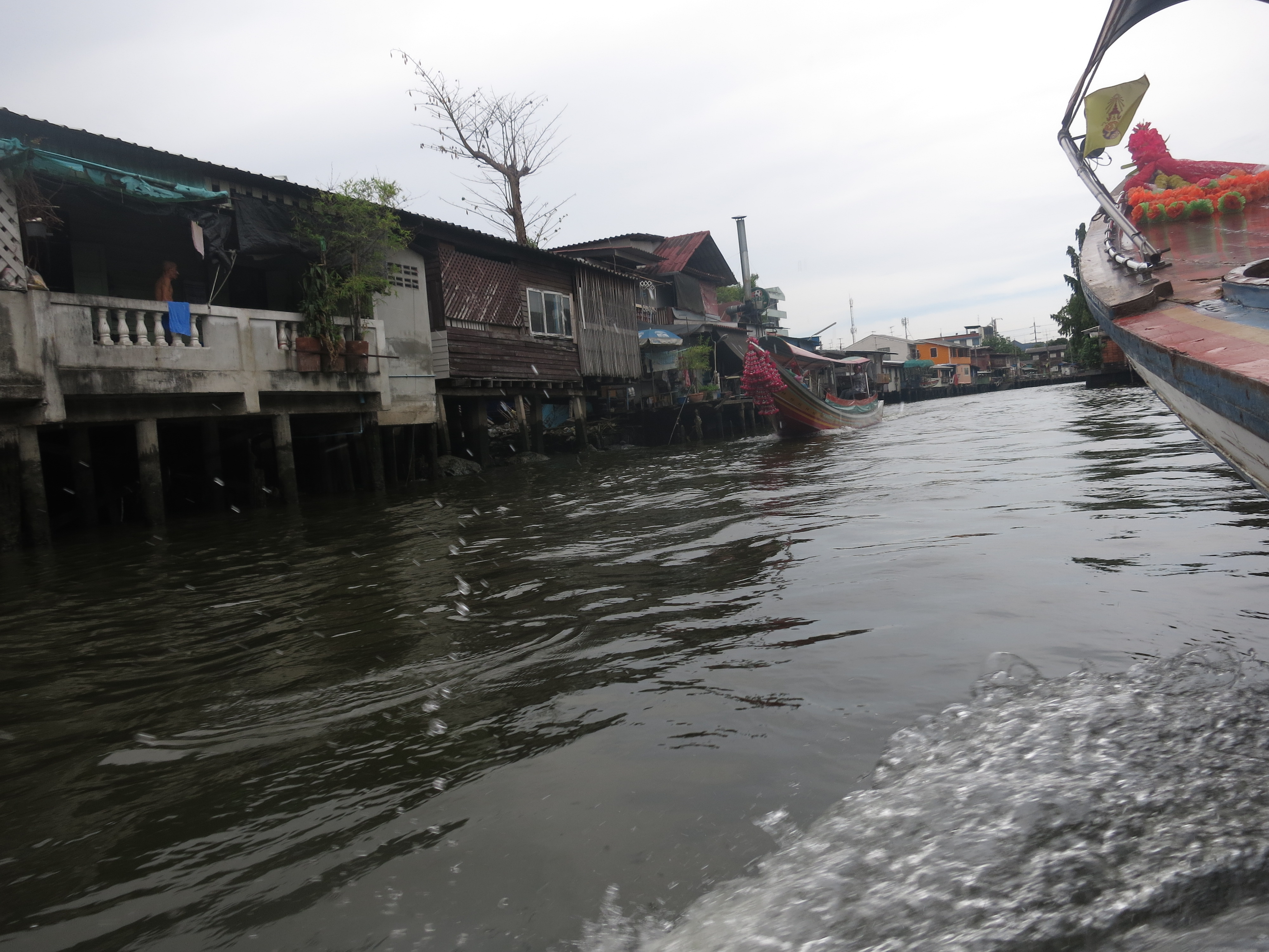After that we rode around the old capital, across the water from the current capital and abandoned a few centuries ago because it's flood-prone. We weaved through streets, past and through more of the hundreds of wats in Bangkok and got on a Longtail boat, going along the river for a while, then off into canals through the backwaters of Bangkok. Longtail boats seem to be the main design of craft around Bangkok – long and thin with a graceful arch on the prow, they seem perfectly designed to handle the chop of big waterways with barely a bump as well as squeeze along the many small side canals.
