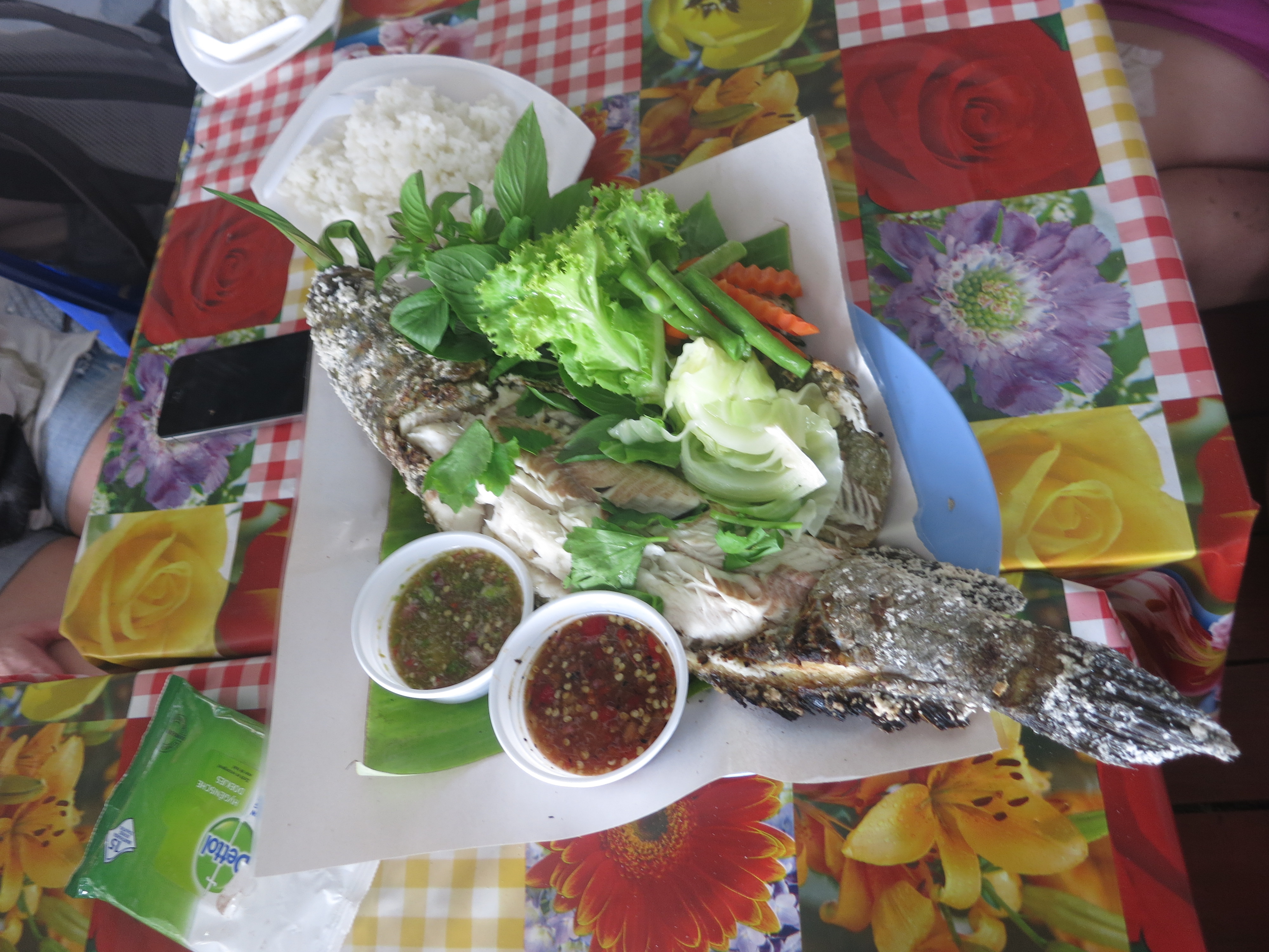 Lunch at a floating market. Salt-rubbed snakefish grilled over coals.