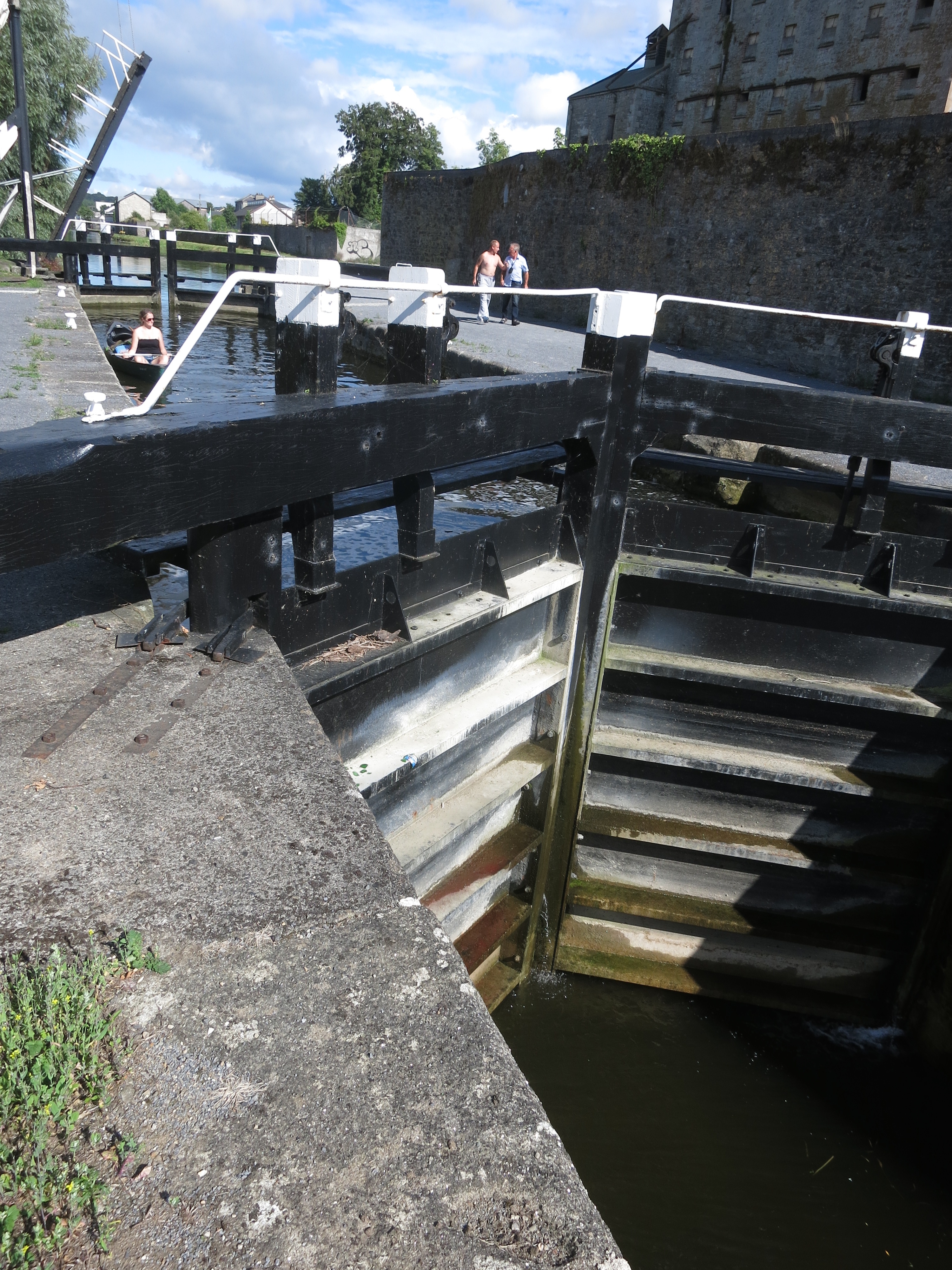 Niamh waiting at the lock near Bagenalstown. The fella with his top off is the one who gave us a lock key.