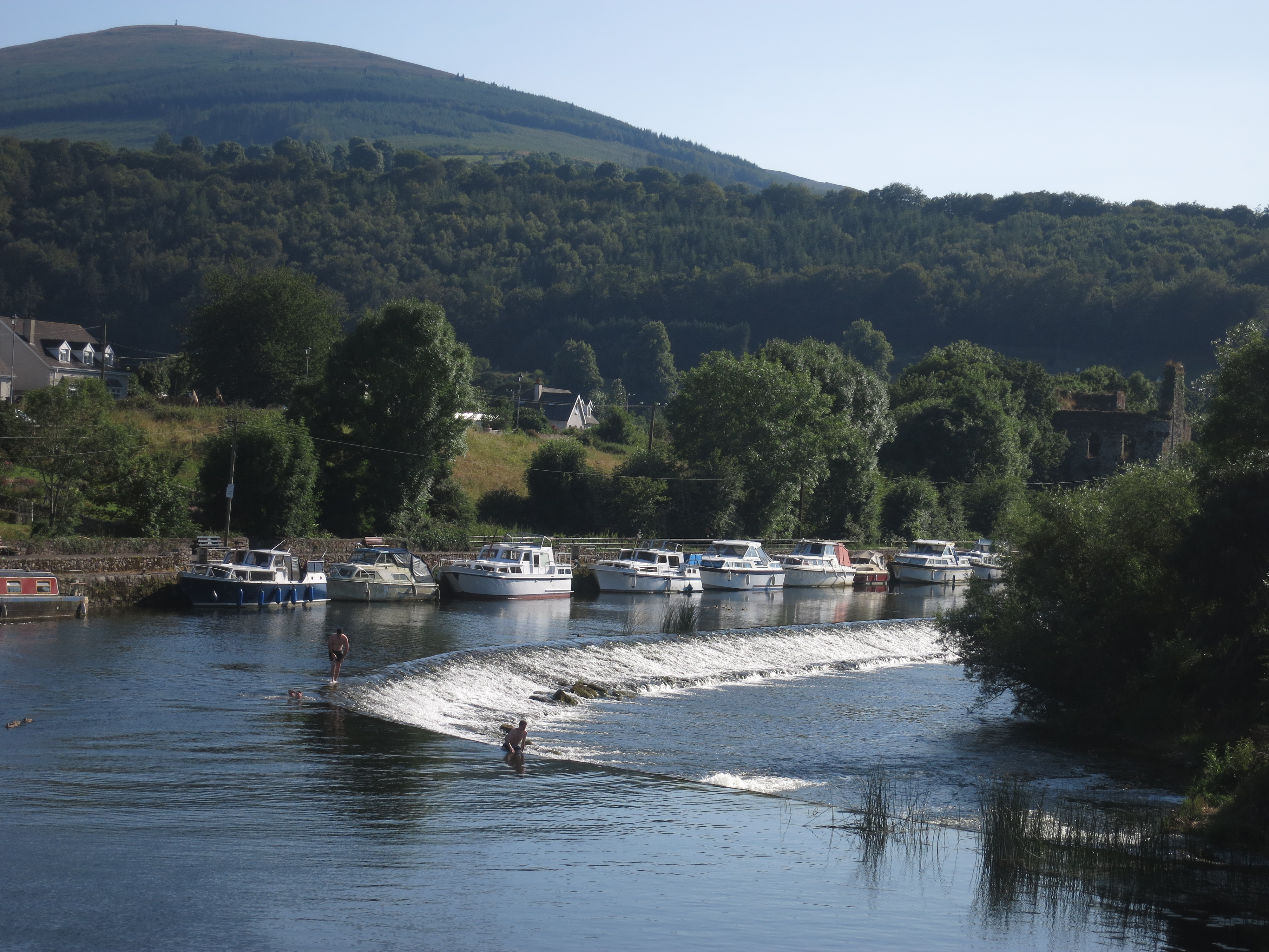 We spent another few hours paddling through forest, eventually reaching the lovely town of Graiguenamanagh mid-afternoon and had a 'breakfast' of roast ham, mashed potatoes, cabbage and carrots, then a long doze in the shade of a tree overlooking the river. The town was set on the river, which there was wide, and moored along it were dozens of barges. All along the river we'd seen barges and it seems a fair number of people live on them, while others spend holidays aboard. Ireland, as well as having rivers made navigable by weirs and locks, also has a number of canals connecting river systems, most notably the Grand Canal and the Royal Canal, so that one can travel by barge from the Irish Sea in the south-west, along the River Barrow, right up to Northern Ireland or across to the Atlantic Ocean via the Shannon River.