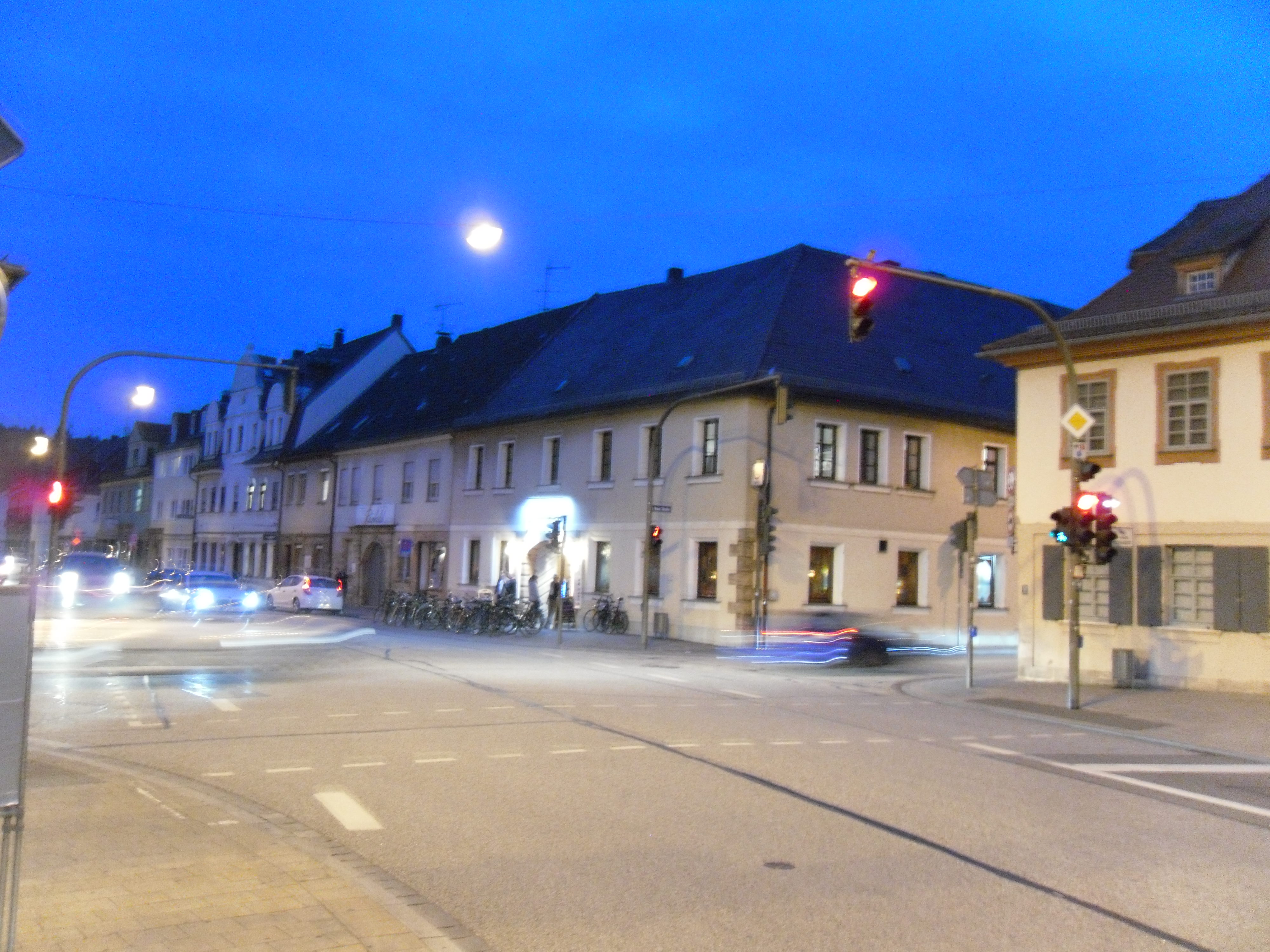 Erlangen by night, with the Pleitergeier on the corner.