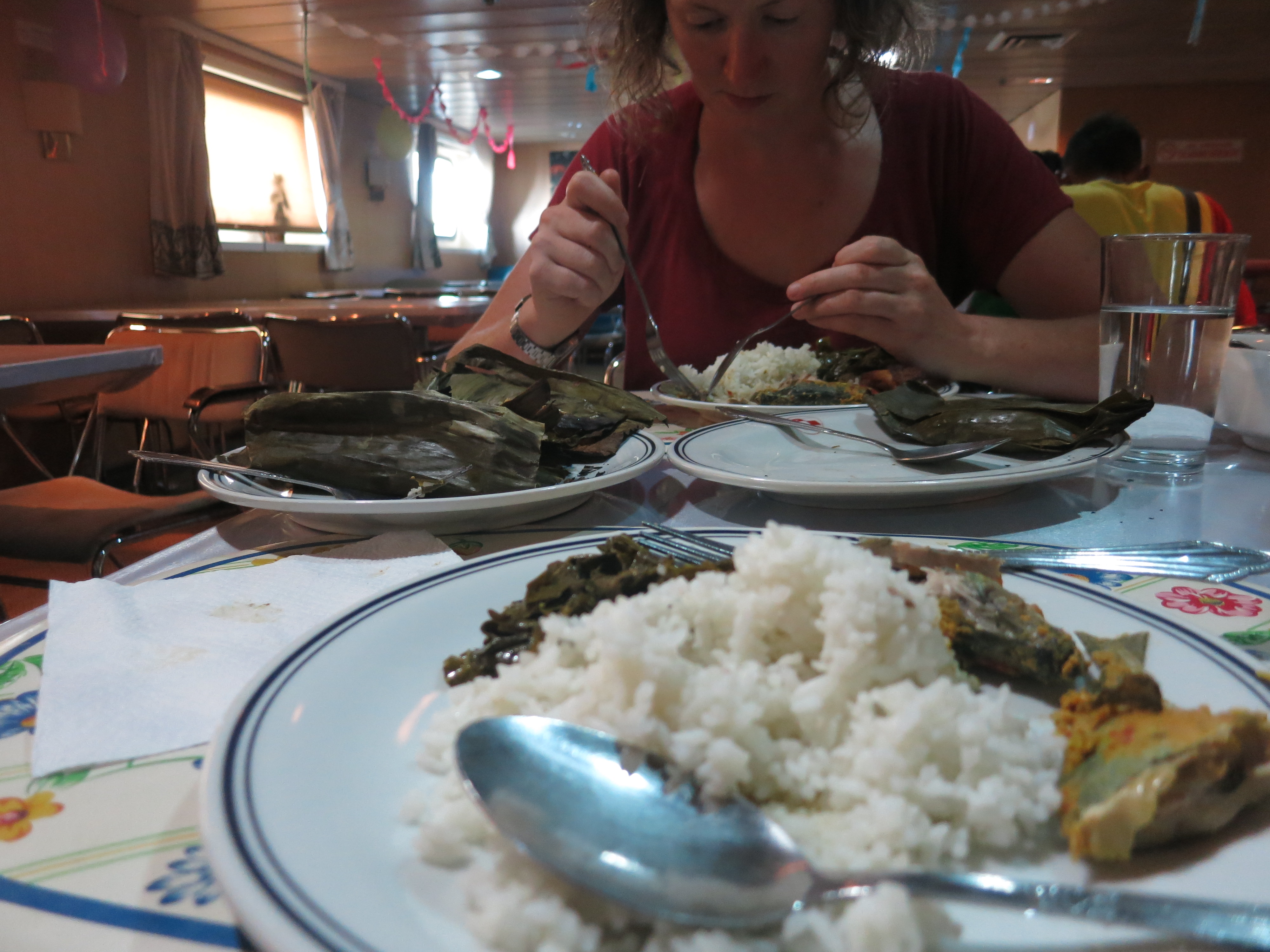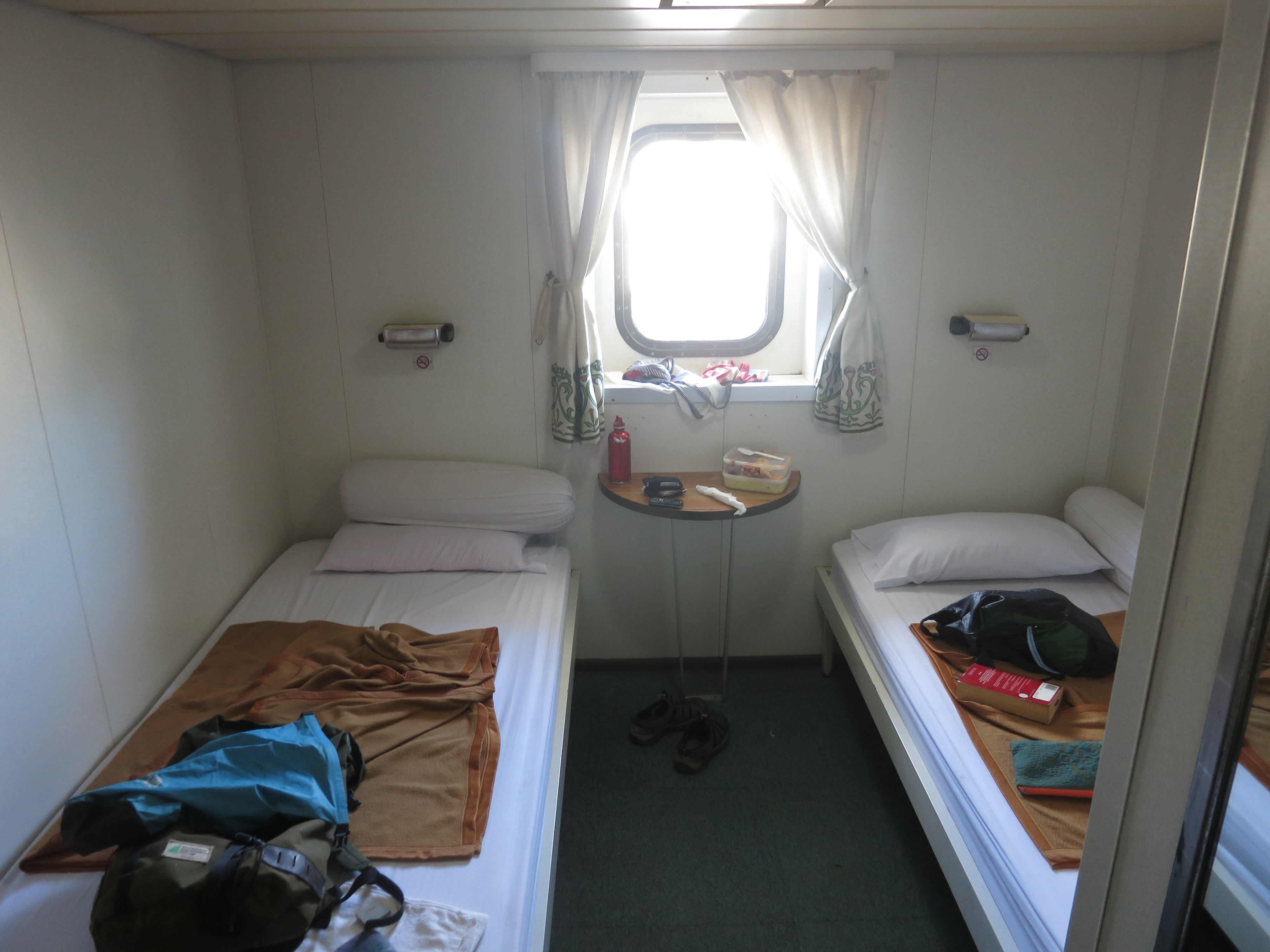 The vessel is certainly showing its wear, but is well-maintained in the face of the constant pressure of numbers it obviously gets. The essentials function well enough and within limits everything is clean and tidy – we certainly enjoyed the trip. We took first-class berths, meaning two beds in a room, as opposed to second-class' four single-gender beds per room or the challenge of four nights in a loud, crowded, smoke-filled dormitory! This fare included all meals. It was a little less than the equivalent airfare or about half the price of an overnight bus to Alice Springs, but I imagine out of reach of most of the other passengers, who overwhelmingly travelled economy or non-berth.