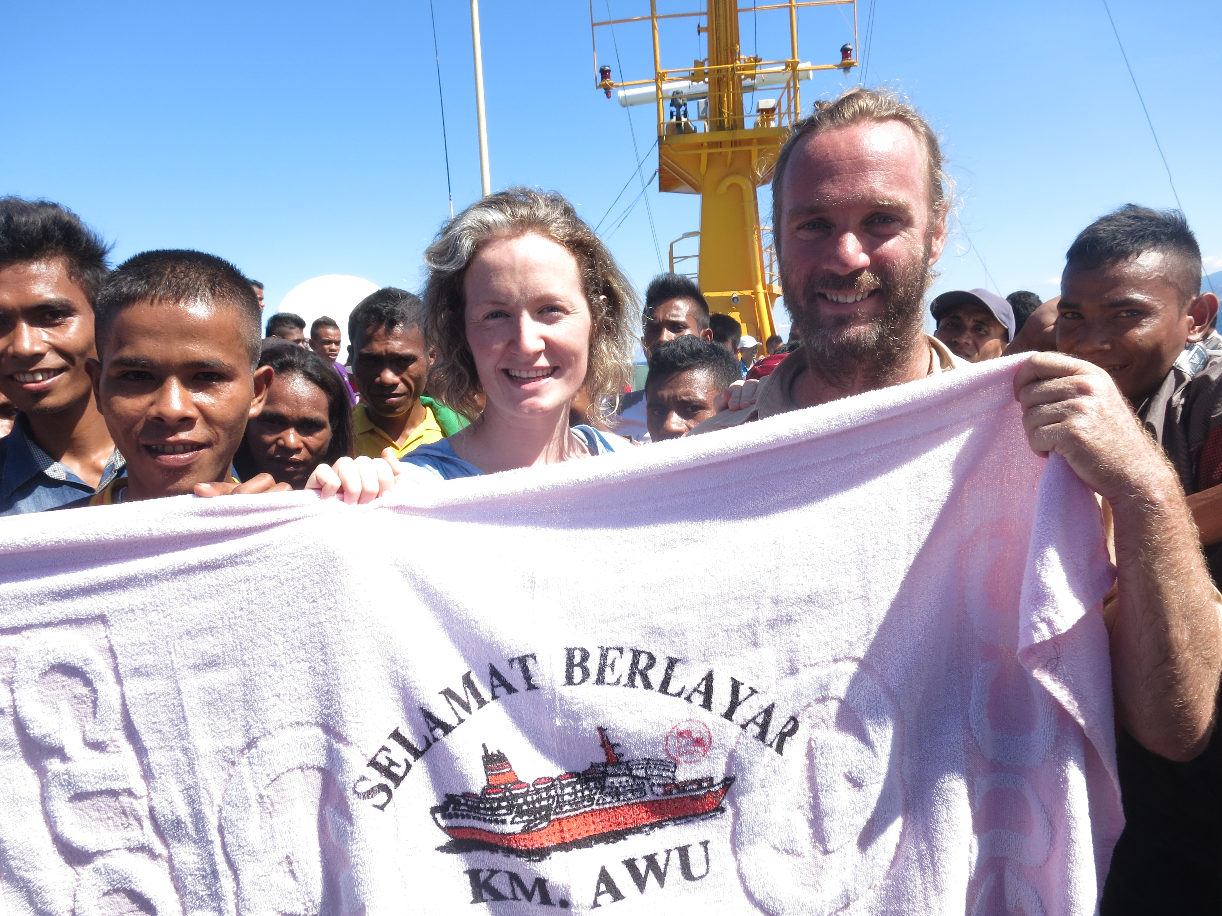 Being the only westerners, we were an object of constant attention and made to feel very welcome. There was, as far as we understand it, celebrations for the 62nd (or 62th as the posters had it) anniversary of Pelni, so the dining room had streamers and balloons and, one fine morning, a tug-of-war on the top deck, which I was made to understand I would be competing in! We were in teams of six I think, with five teams competing. Well, I'm pleased to say, after a gruelling few rounds in which we remained unbeaten, I was part of the winning team, after which I was put centre stage to receive the prize and celebrate our victory and pose in yet more photographs. The prize was a box of towels, emblazoned with a picture of the good ship KM Awu!