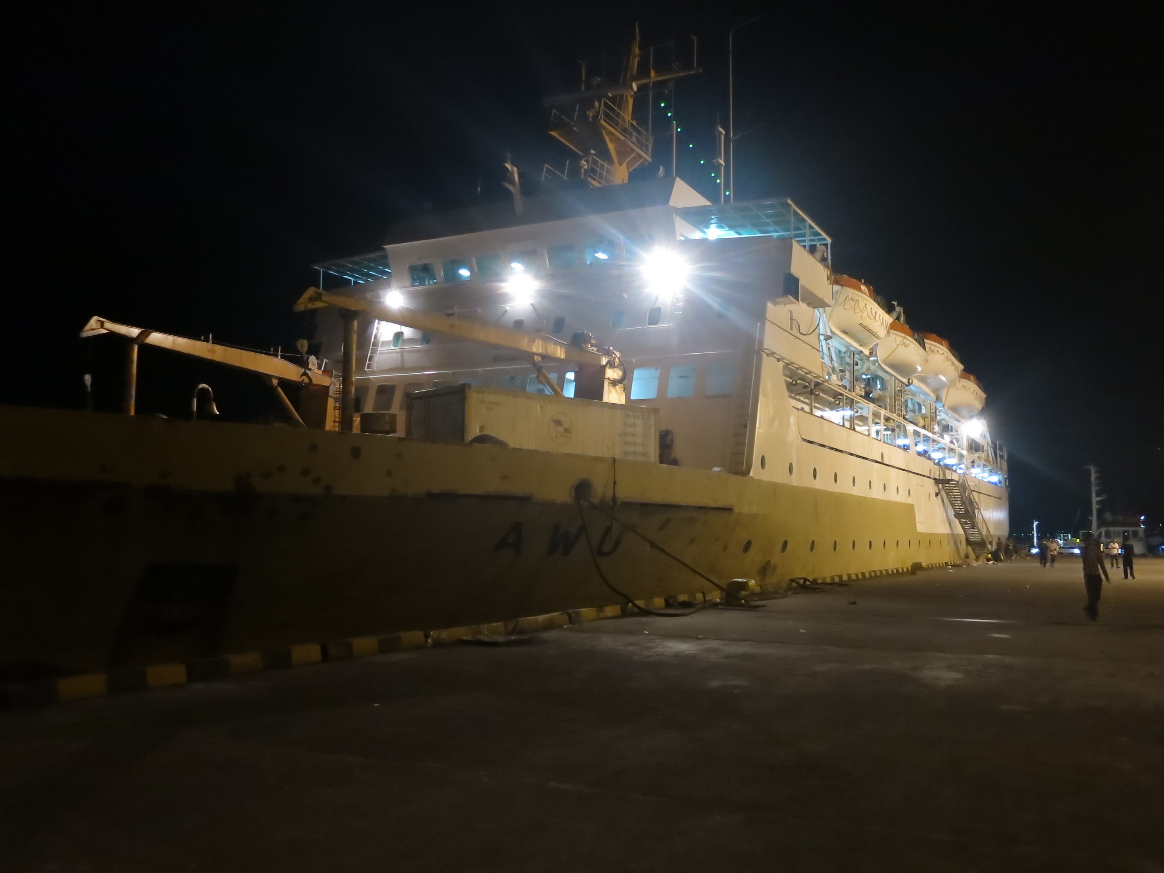 The KM Awu is an ageing ex-European (possibly German, if the original ship diagrams are anything to go by) passenger ship, 99.8m long according to the statistics on the ship diagram and rated for 969 passengers and 84 crew.