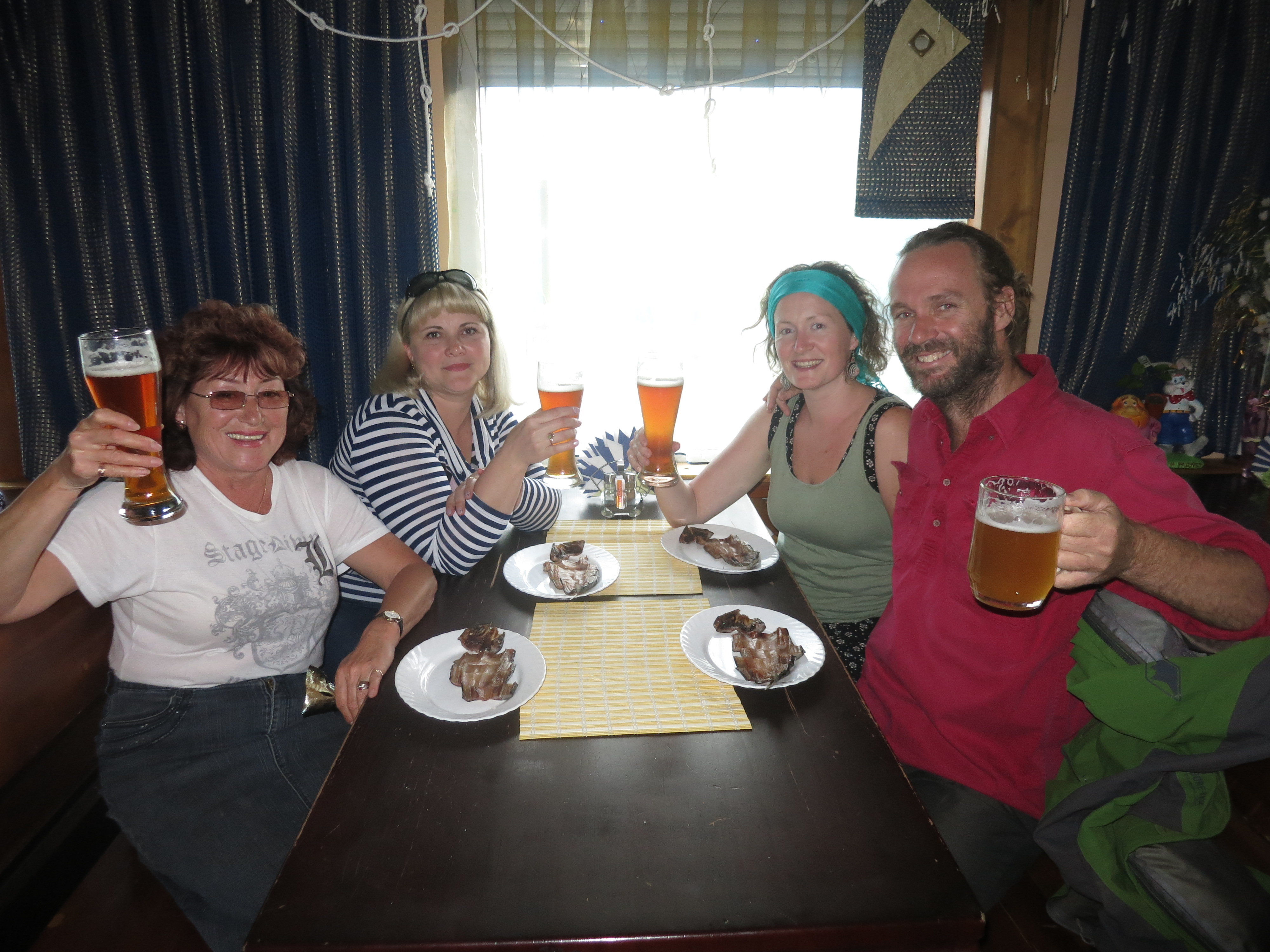 Drinking locally brewed beer and eating a famous local fish, Omul, with Galina (far left) and Natalya.
