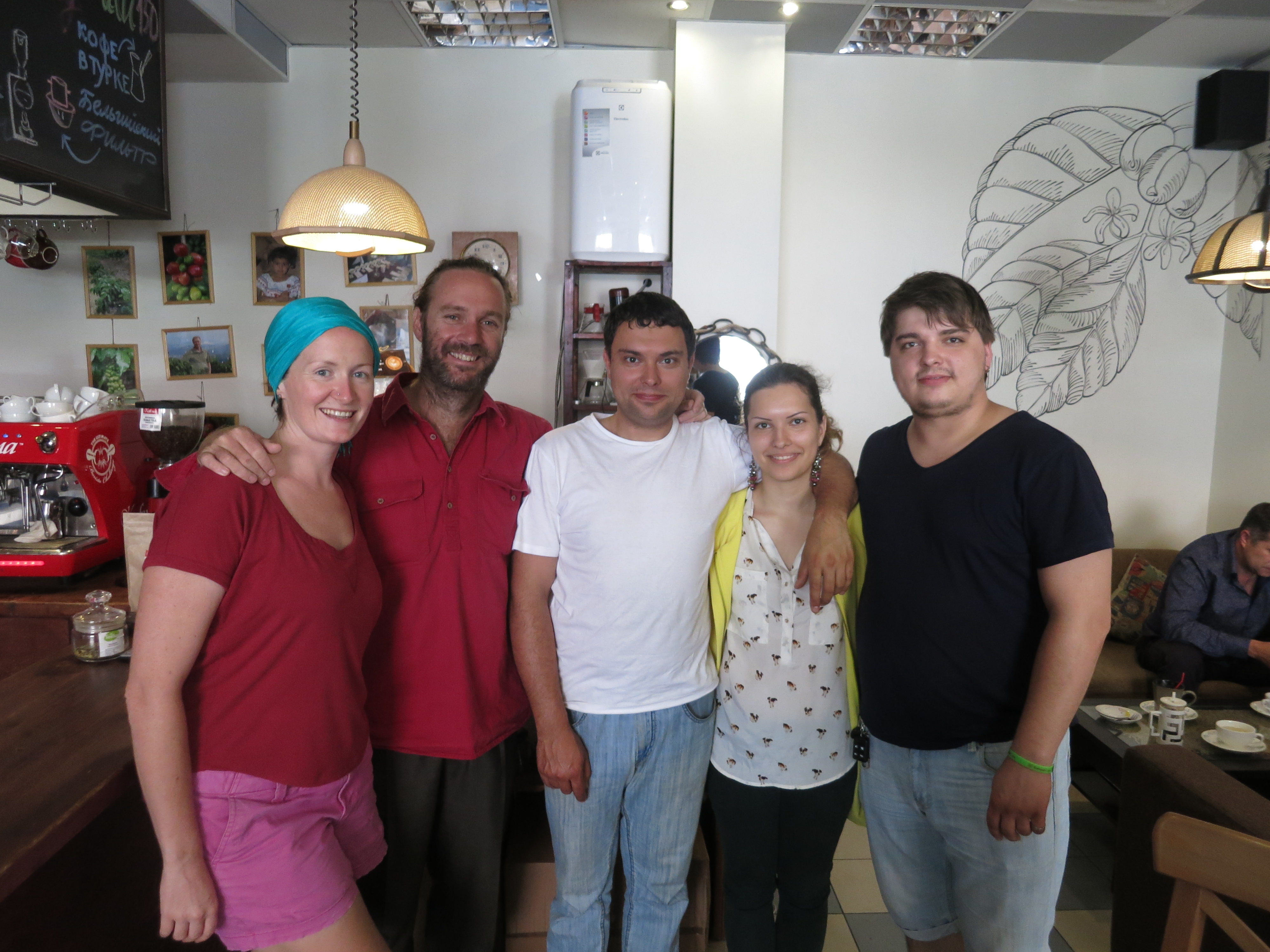 With our couchsurfer hosts Olga and Efim (on right) and Olga's brother Ilya (centre) in the cafe where Efim works (and incidentally makes very, very good coffee!)