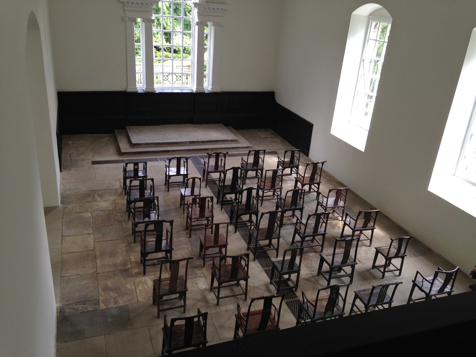 Looking at the arrangement of the chairs, I also found myself thinking about internal (as opposed to external) oppression. While chairs of different sizes and styles had clearly been chosen to represent individuality and autonomy, and they were spaced widely apart enough to allow people to contemplate in peaceful solitude, they were lined up in neat columns facing the front. This ordering, to me, betrayed a mind still trapped in linear, authoritarian ways of looking at the world (and if you think that's too great a leap, you haven't read a modern art catalogue in a while!), a natural, unconscious instinct to line up neatly, facing towards an authority, the fact that it was an absent one all the more poignant.
